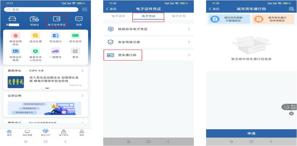第一步:驾驶员下载注册“交管12123”APP,点击首页的“电子证件凭证”→【电子证书】→【卡车通行码】,可以查看【城市卡车禁行管理规范】和【城市卡车通行码申请规定】,也可以点击底部的【申请】进入卡车通行码申请界面。