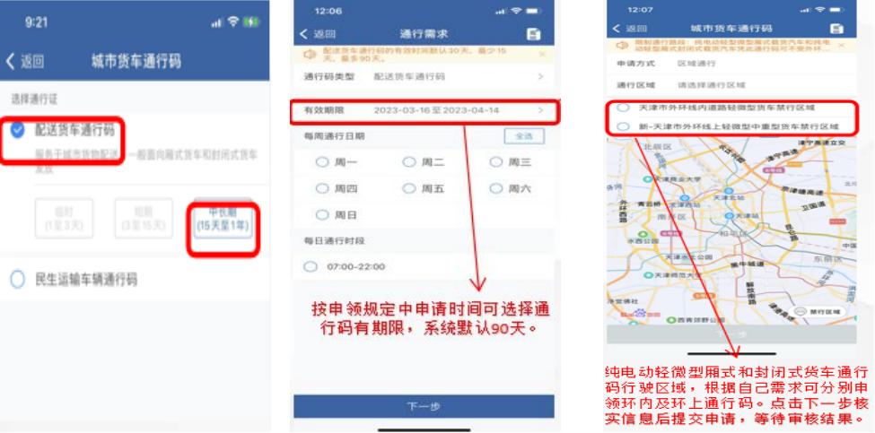 第三步:点击“送货车通行码”→进入“通行需求”页面【中长期】。选择有效期(15-90天,默认90天)、每周交通日期和每日交通时间点击[下一步]。根据实际交通需求,选择【天津市外环线内路面轻型货车禁区】、【新-天津市外环线轻中重型货车禁行区域】→[下一步]。