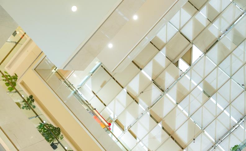 在中庭玻璃采光区,蜀山万象汇贴有隔热膜。