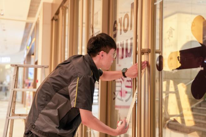 购物中心工作人员为部分门贴密封条,减少冷气流出。