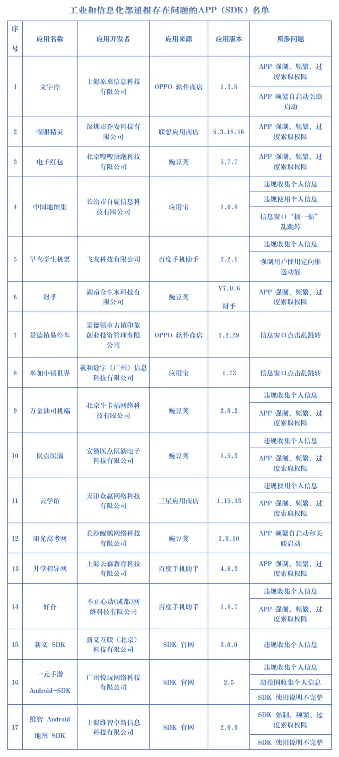近日,工信部组织第三方检测机构对17款APP和SDK进行抽查,发现有损害用户权益的行为,并督促其按照相关规定进行整改。(来源:工信部官网)