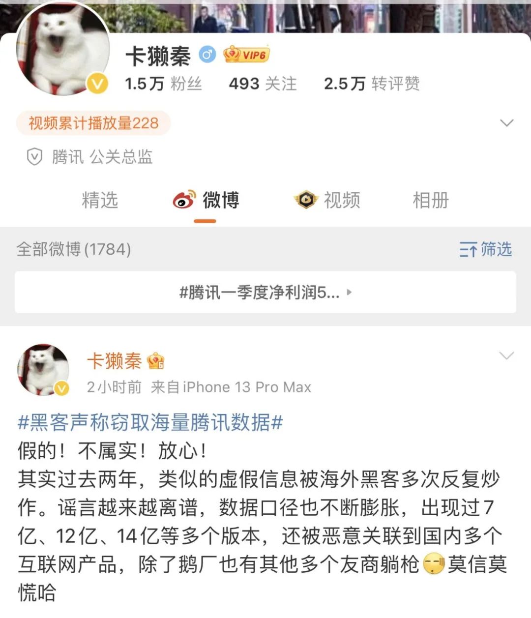 八月十四日,微博认证了@卡獭秦,腾讯公关总监。 回应有关话题辟谣说:“假的!不是真的!”