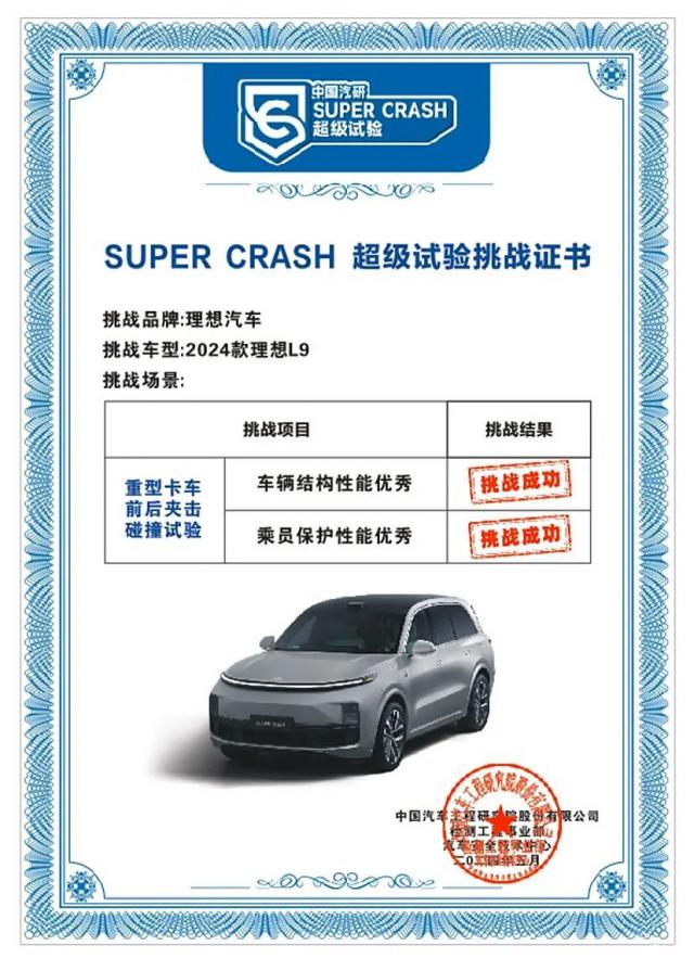 日前,中国汽车工程研究院股份有限公司(以下简称中国汽车研究院)宣布参与理想汽车” SUPER CRASH 2024年非常实验的“挑战结果” 款理想 L9 在车辆结构、乘客保护、约束系统、电力安全、事故后救援等维度上,成功通过重型卡车前后夹击试验工况。获得中国汽车研究所授予的" SUPER CRASH 很有实验性的“成功挑战证书”。