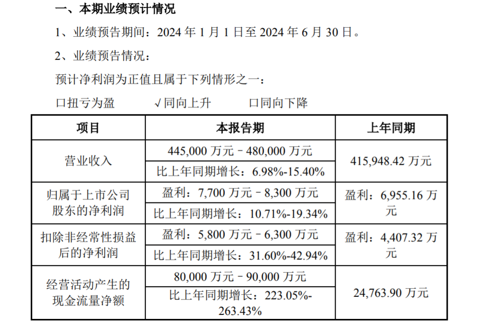 预计2024年1-6月营收同比增长6.98%-15.40%,至44.5亿-48亿元;预计净利润同比增长10.71%-10.34%,至0.77亿-0.83亿元;预计经营活动产生的净现金流同比增长223.05%- 在8亿-9亿元之间,263.43%。