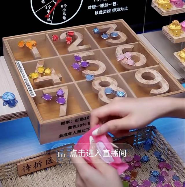 接着,主播会依次将拆开的乌龟放在眼前的九宫格上,如果中间拆掉你祈祷的乌龟,马上再加一包。等到九宫格满了,就看上面有没有同色的乌龟对子,有几对就再拆几包。