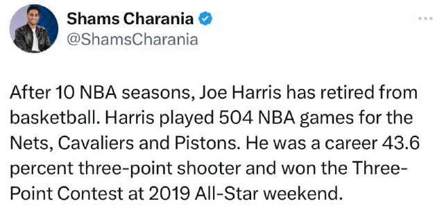 据 nba “爆料大王” Shams Charania 透露,32 年龄射手,曾经的 nba 三分球大赛冠军乔 · 哈里斯正式宣布退役。