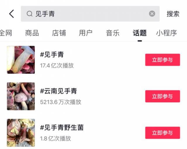 到目前为止,抖音「野生菌」共同获得了话题 233.1 亿个播放,「见手青」播放量高达 17.4 亿,稳定已经成为流量的新贵。