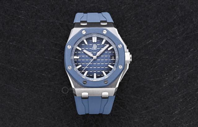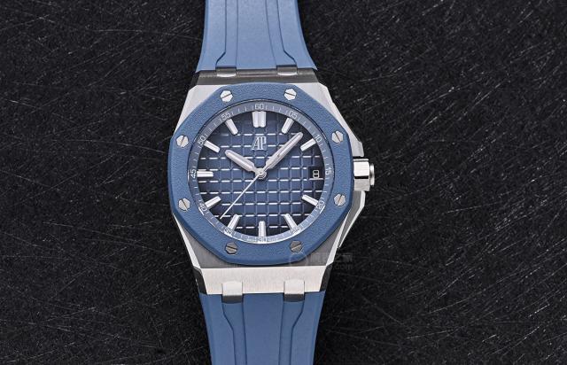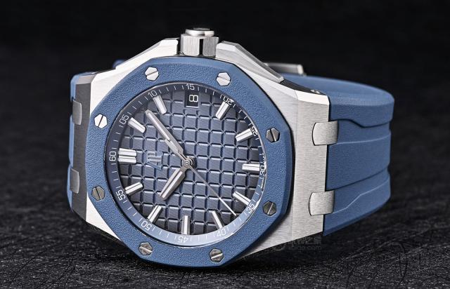 新款爱彼皇家橡树离岸型手表 15605 其中一个亮点,体现在蓝色八角形表圈的设计上。爱彼采用了用橡胶包裹金属的创新处理方法,这种设计不仅为手表增添了一丝现代感,而且带来了独特的触感。对橡胶材料的应用,其实如果熟悉离岸型就可以发现,爱彼早在 2002 2008年,将橡胶材料应用于其标志性八角形表圈,推出离岸型。 25940SK,成就造表行业第一。与此同时,爱彼皇家橡树离岸系列的材料探索从未停止过。表圈已经玩了相当多的材料,比如传统的钢圈、瓷圈、碳纤维圈,现在的橡胶表圈,爱彼不断打破传统造表的界限,巧妙地将功能与设计美学结合起来。