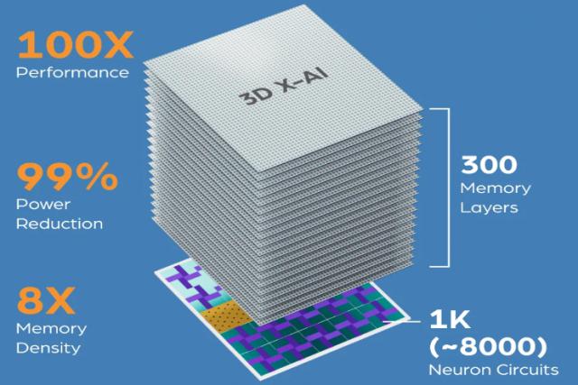 3D X-AI 这是一种芯片 AI 处理量的 3D DRAM 在同一个芯片中,它的底部有一个神经元电路层,顶部有一个 300 层状存储单元,容量为 128 GB。这一创新芯片能提高人工智能芯片的性能。 100 倍数,减少功耗 99%。其具有 8 密度翻倍以上,特别适合存储大型语言模型 ( LLM ) ,用于生成式人工智能应用程序,例如 Chat GPT,Gemini 和 CoPilot。