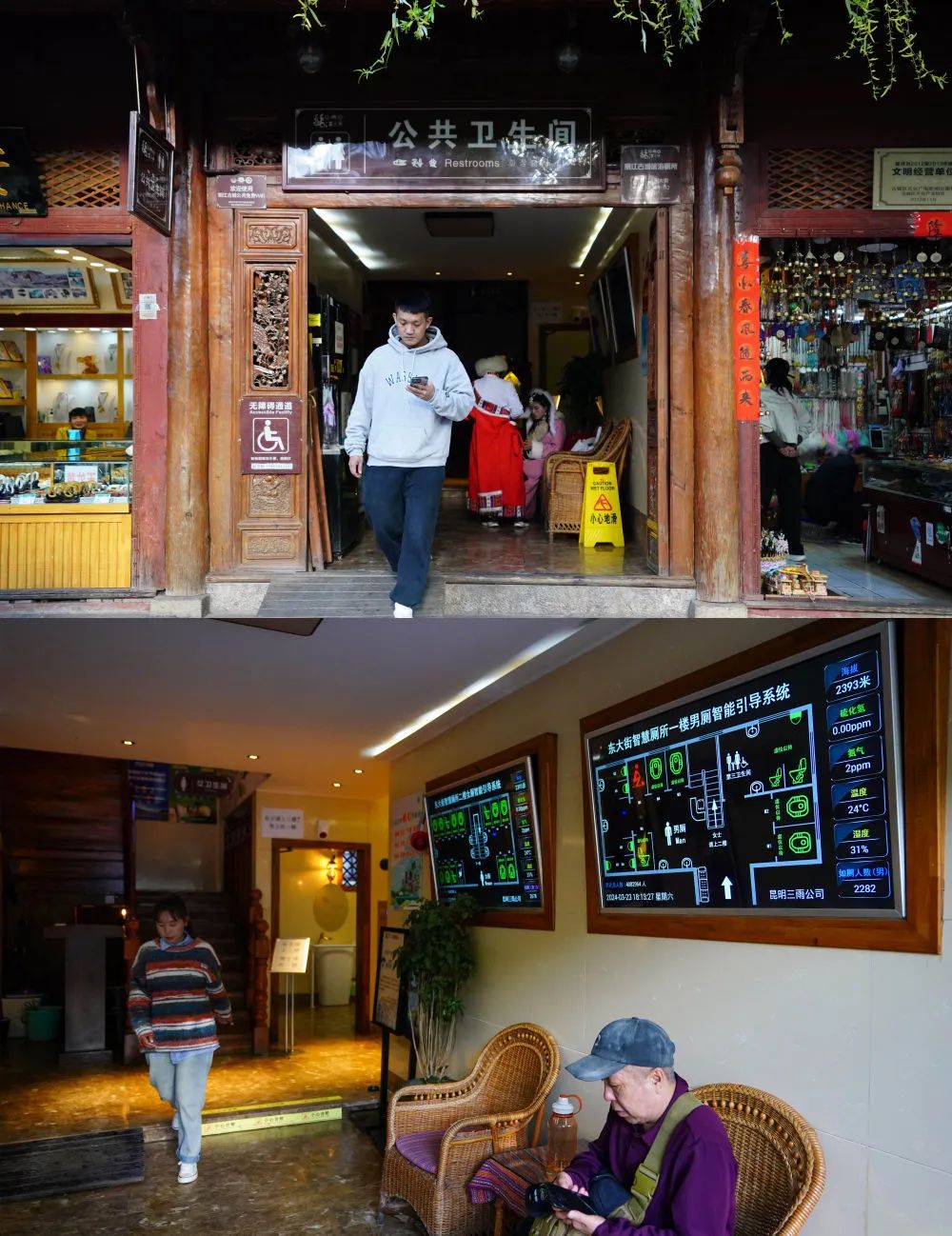 上图为在丽江古城拍摄的智能厕所外景;下图为智能厕所中的智能引导系统大屏幕。新华社记者 陈欣波 摄