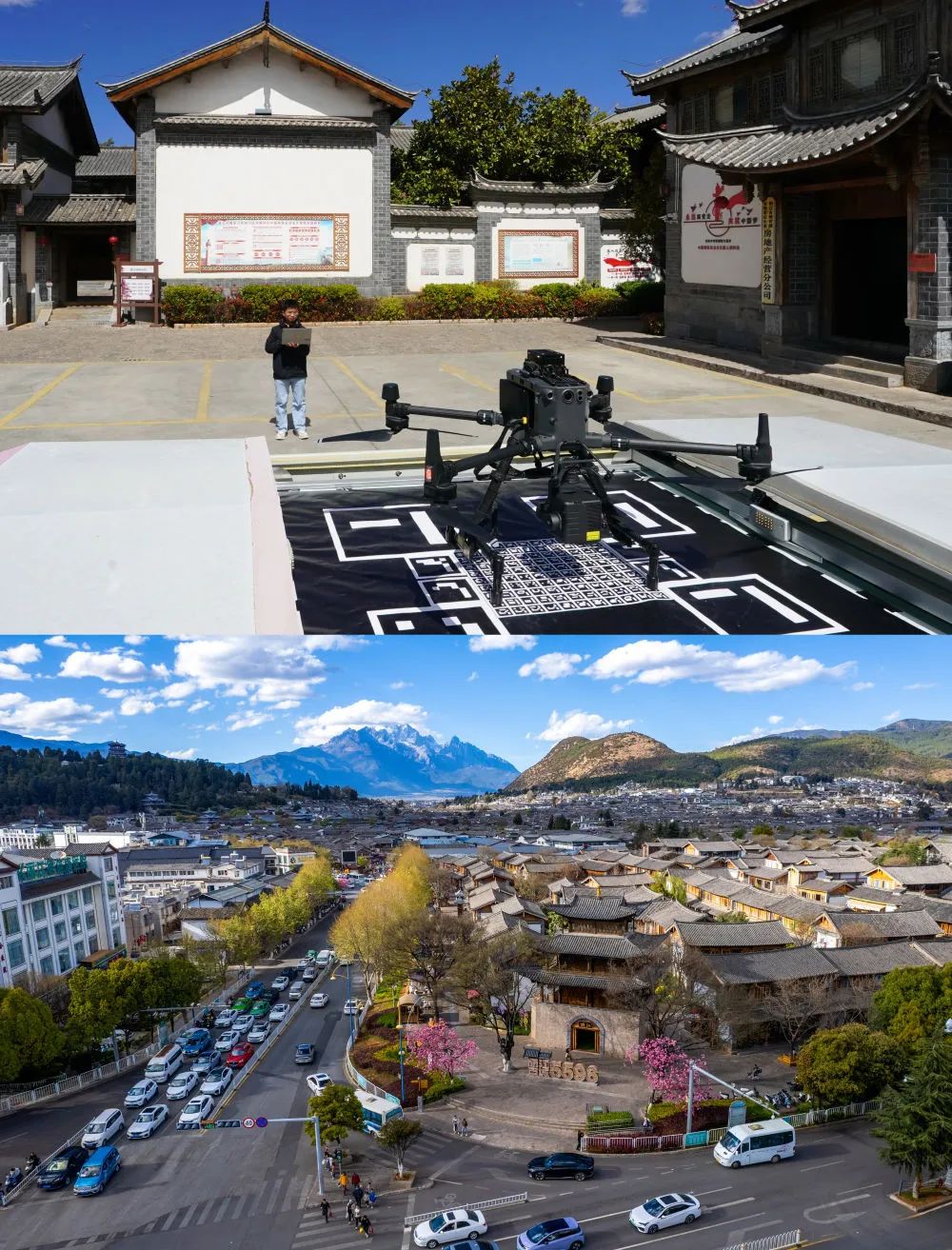 上图为工作人员计划通过计算机操作无人机在丽江古城巡逻;下图为丽江古城拍摄的无人机视角。新华社记者 陈欣波 摄