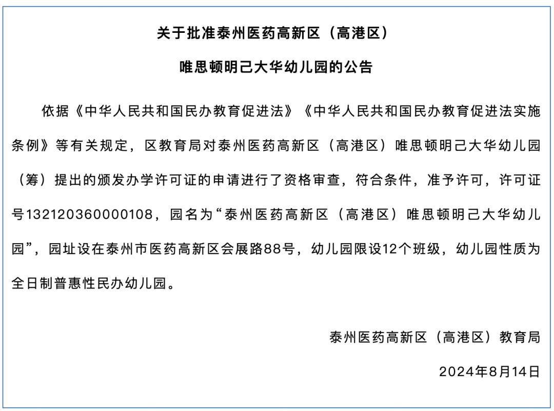 8月14日,医药高新区(高港区)教育局发布公告,允许泰州医药高新区(高港区)唯思顿明己大华幼儿园。公园位于泰州市医药高新区会展路88号,幼儿园限12个班。幼儿园性质为全日制普惠性私立幼儿园。详情如下。