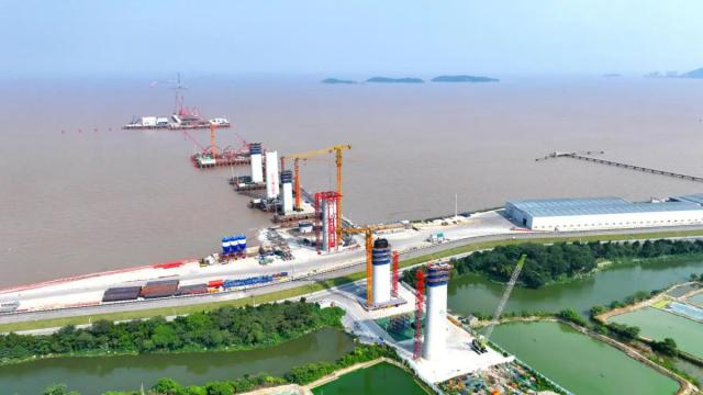 ▲进入主塔施工阶段的杭州湾跨海铁路大桥。