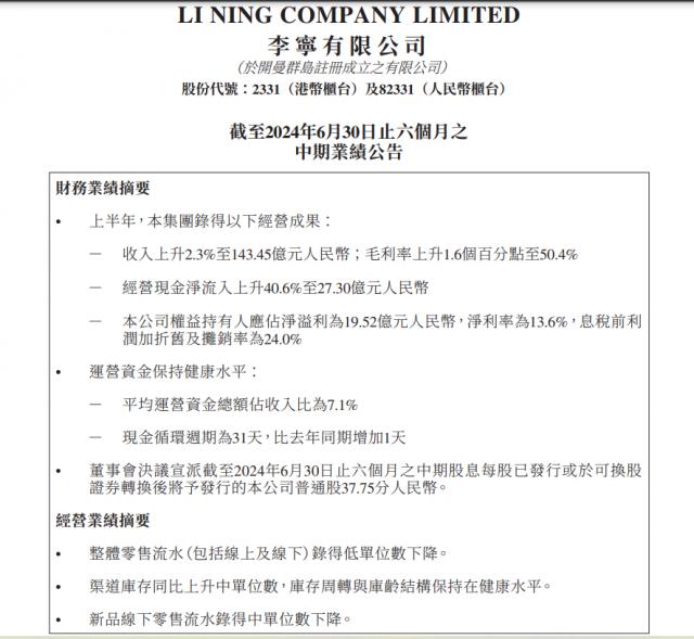 李宁 (02331) 公布中期业绩,上半年收入 143.5 亿元,同比增长 分析师预期2.3% 142.3 亿元。