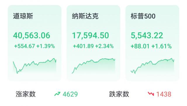 在收盘时,道指上涨 554.67 点,涨幅为 1.39%,报 40563.06 点;纳指涨 401.89 点,涨幅为 2.34%,报 17594.50 点;标普 500 指数涨 88.01 点,涨幅为 1.61%,报 5543.22 点。
