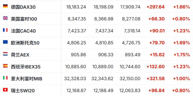【欧股】美国的零售业数据很强,减少了对经济衰退的担忧,欧股也得到了改善,德国 DAX30 指数涨 英国富时英国1.66% 100 指数涨 0.80%,法国 CAC40 指数涨 欧洲斯托克1.23% 50 指数涨 1.69%。