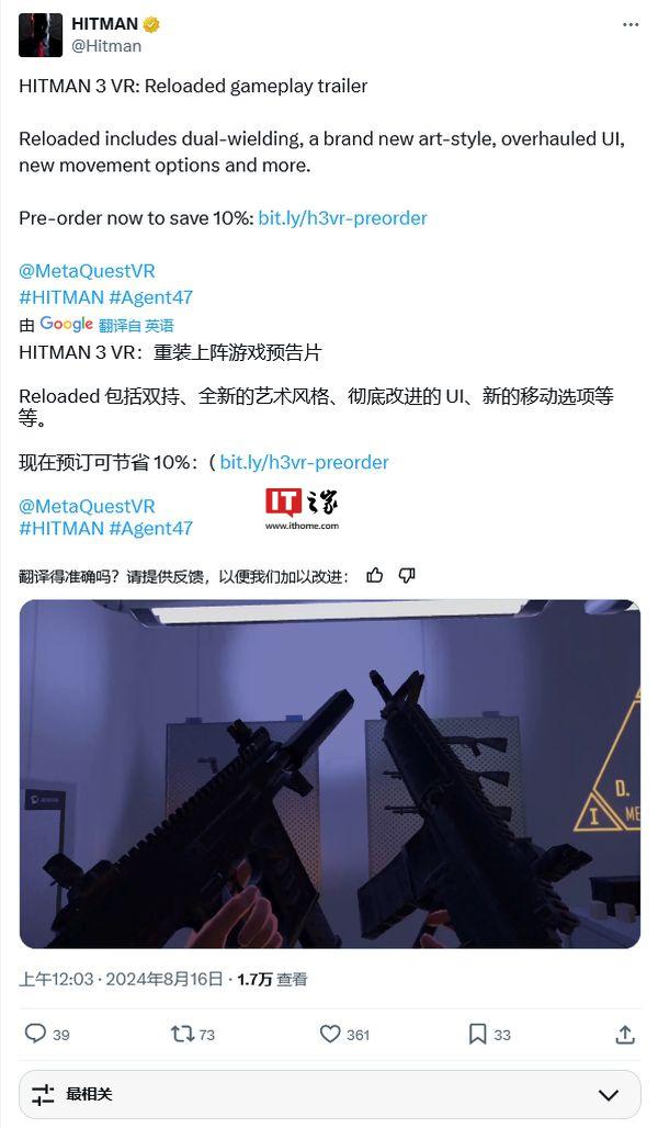 IT 世家 8 月 16 日消息,“杀手” 3 VR:重装上阵》(Hitman 3 VR: Reloaded)这款游戏已经发布了第一个预告,但是官方并没有公布该作品的发布日期,视频中仍显示“即将推出”。