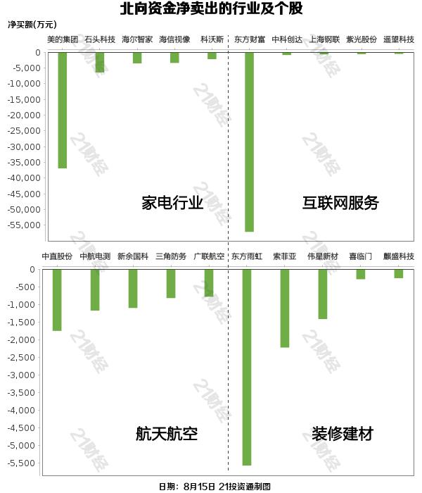 北向资金减持 12 其中,家电行业数量最多,净销售额达到 4.03 亿元,其次是互联网服务业,净卖出。 1.60 亿元。