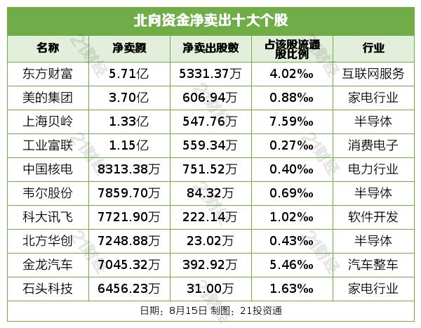北向资金净卖东方财富 ( 300059.SZ ) 、美的公司 ( 000333.SZ ) 、上海贝岭 ( 600171.SH ) 、工业富联 ( 601138.SH ) 、中国核电 ( 601985.SH ) 其中,东方财富被净卖出。 5.71 十亿美元,美的公司被净卖出。 3.70 亿元,上海贝岭的净销售 1.33 工业富联被净卖出亿元。 1.15 亿元,中国核电被净卖出。 8313.38 万元。