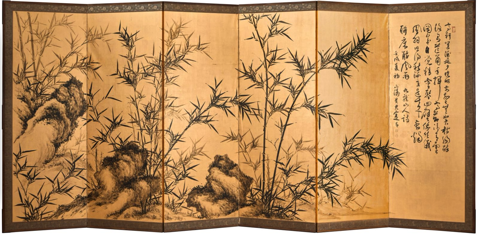 一九八二年,九龙山人诗意墨竹,水墨金条六曲金屏,