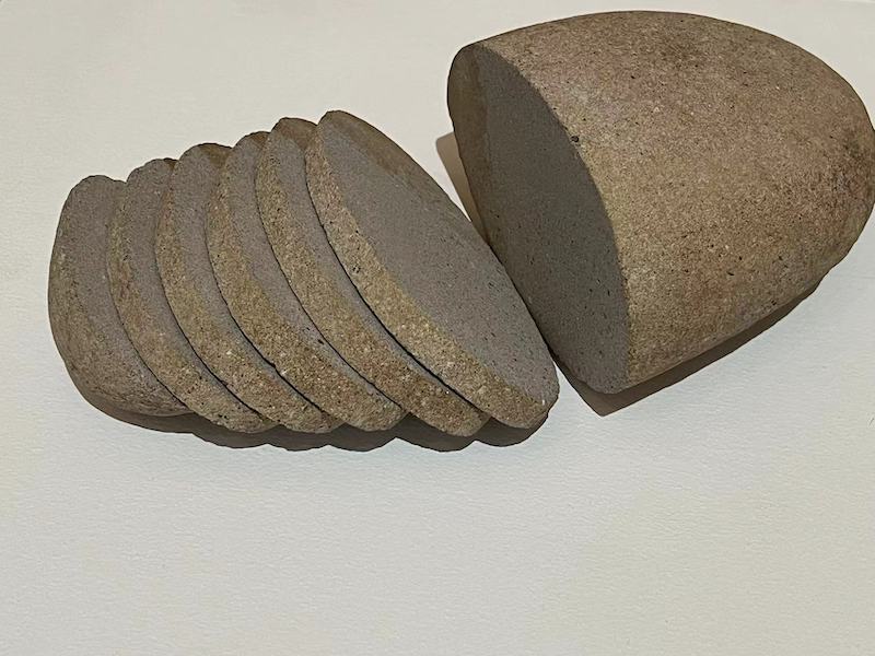 当提到“纪念碑”时,石头无疑是最常见的承载媒介。展览《片刻即纪念碑》中,也有不少作品使用石块作为创作媒介。其中,作品《面包》是扎娜·卡德洛娃在俄乌战争期间在避难村的河流中捡起的石头,现在在基辅生活和工作,用角磨机加工切割,让它们看起来像被切割的乌克兰面包。这种面包在战争中被赋予了特殊的民族意义。中国艺术家黄靖杰也从溪流中捡起各种各样的石头,并根据自己的形状进一步打磨和工作,以轴对称的方式切割成抽象的人物脸谱。詹姆斯普拉姆擅长创造性地转换不同材料的材料和重量:轻与重、软与硬、光滑与粗糙...他将古老的木材与坚固的黑色水泥结合在一起,使不同材料之间形成平衡与合作,这也隐喻了人与人之间复杂的亲密关系。