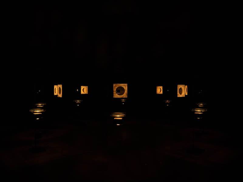 然后,观众可以进入一个黑色的空间,那里是艺术家工作室詹姆斯普拉姆的作品《斑驳的月亮》,将布满青苔、地衣和污垢的废旧玻璃片切割拼接,形成8个月相的图形。借助光学投影,它展示了一个诗意的片段,似乎时间是分层的。
