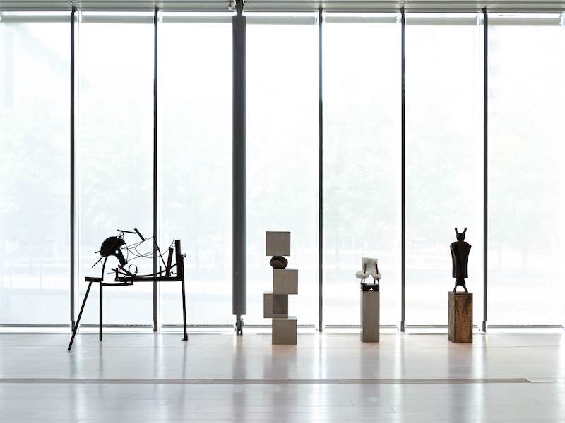 在艺术博物馆的入口处,观众可以看到四件并置的雕塑,并讨论了纪念碑的抽象含义。左边,艺术家安东尼·卡洛和何塞·达维拉的作品展示了雕塑可以让人感受到凝结和流动之间的辨证。在右边,玛丽安·维塔尔的作品是铁轨之间的连接部分,表现出工业产品的抽象感。