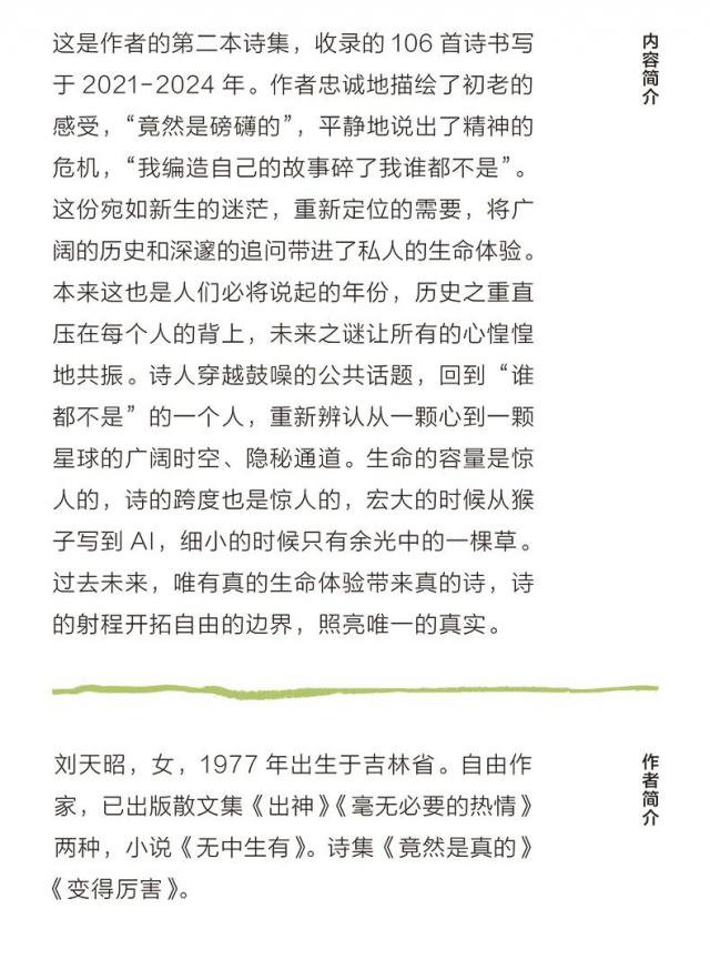 “竟是真的”是真的刘天昭第一集(点击购买购买)� �《是真的》)。起初,她在手机上写诗,然后发到朋友圈和微博。当时突如其来的明亮场景,突如其来的清晰想法,突如其来的跌宕起伏,突如其来的记忆,像云一样投下了阴影,都随着她内心的跌宕起伏,不自觉地变成了一首诗。