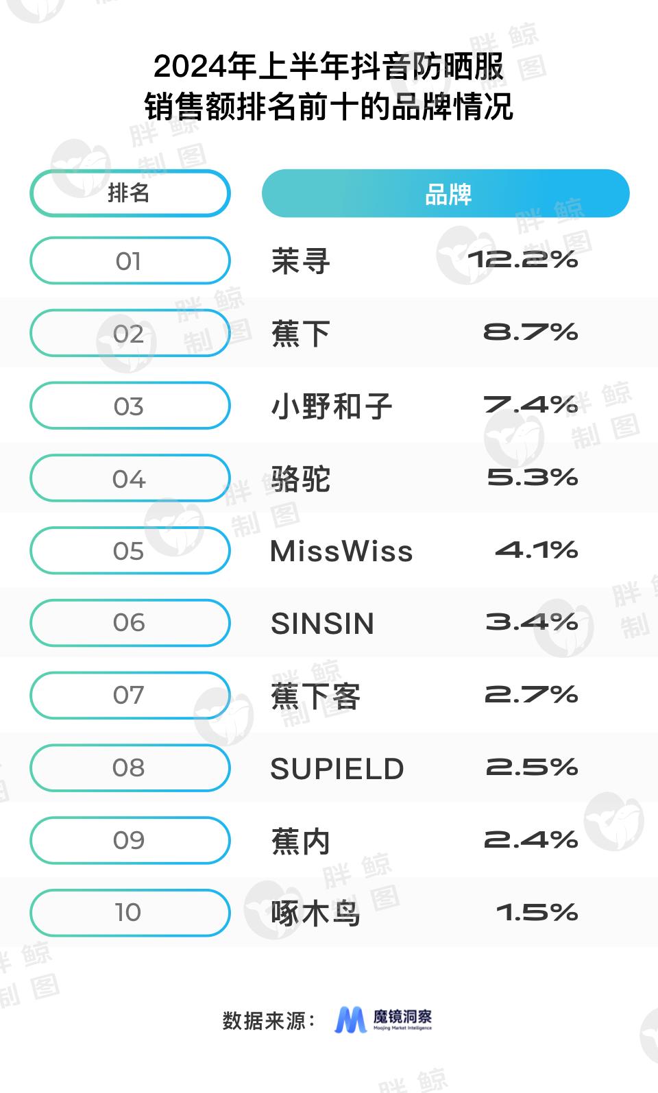 分品牌看,2024年1月至6月,抖音防晒服销售前十的品牌依次是茉寻、香蕉、小野和子、骆驼,MissWiss、SINSIN、蕉下客、SUPIELD、香蕉内,啄木鸟。