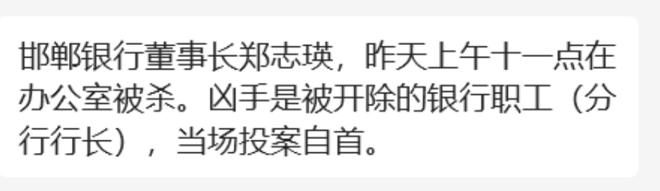 网络爆炸邯郸银行董事长被分行行长杀害,银行工作人员回应|银行财眼