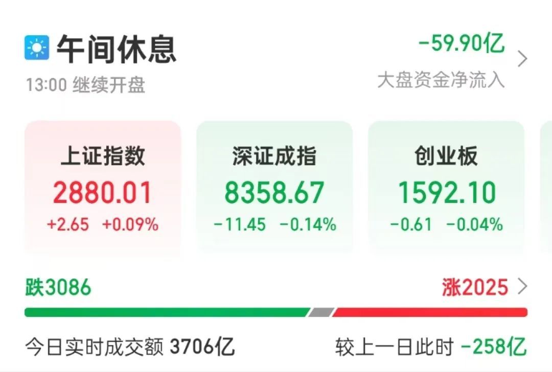 截至中午收盘,三大指数涨跌不一。上证指数上涨0.09%,深成指下跌0.14%,创业板指数下跌0.04%。沪深股市半天成交额3706亿元,比上一个交易日缩水259亿元。