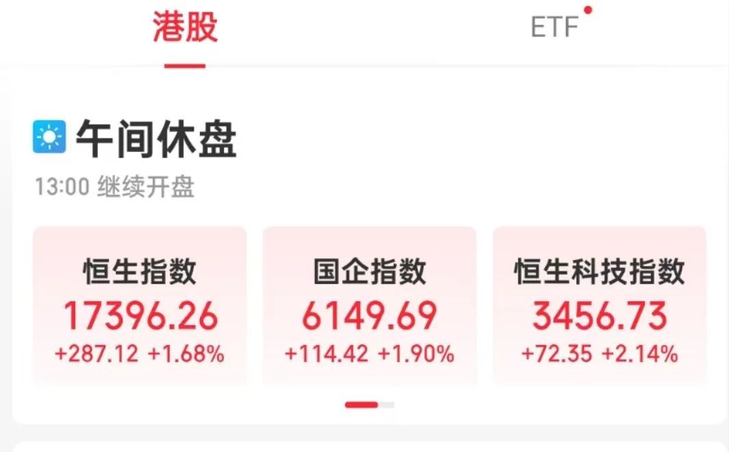 港股业绩可圈可点,恒生指数午盘上涨1.68%,恒生科技上涨2.14%。
