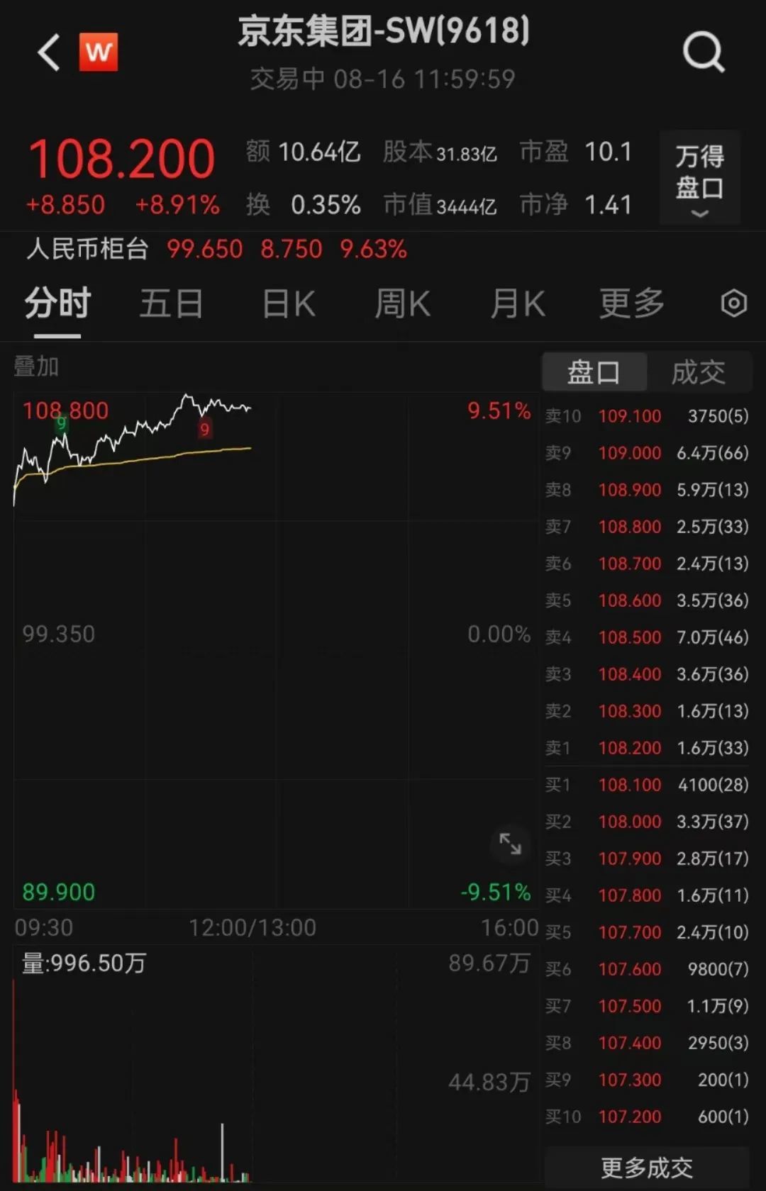 8月16日上午,JD.COM集团-SW持续上涨,中午收盘股价上涨8.91%,报108.2港元,创近一个月新高。总市值达到3444亿港元。
