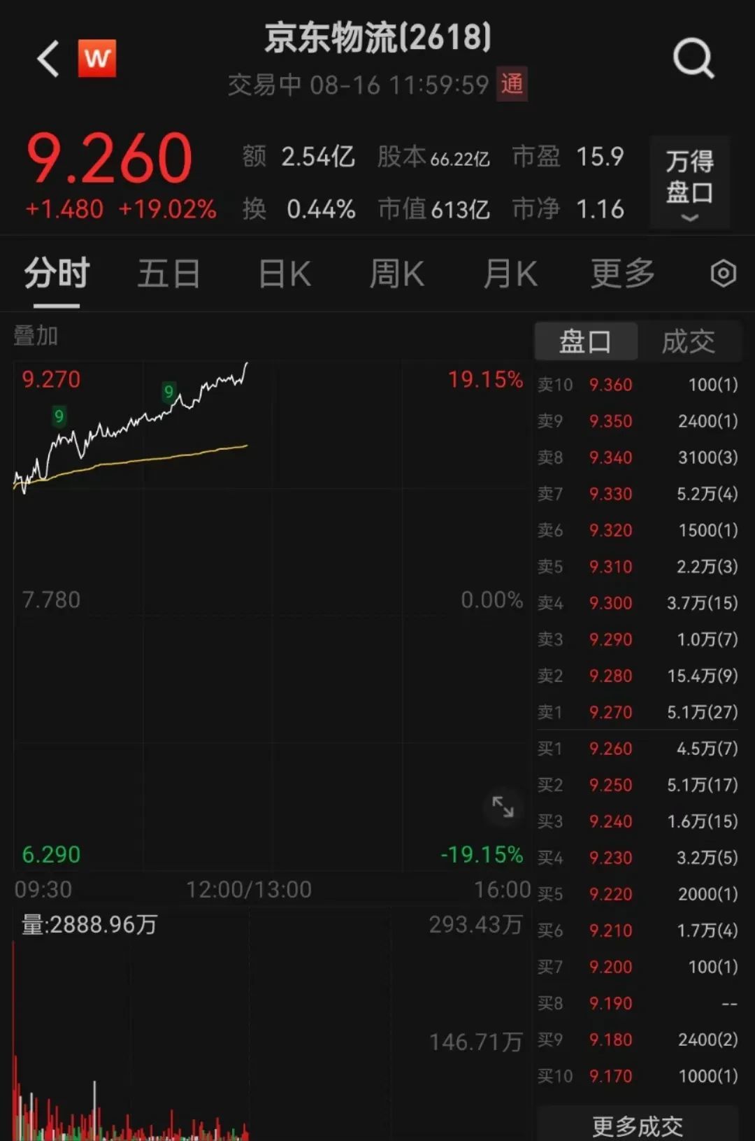 早晨京东物流暴涨超过19%,同样得益于中期业绩。