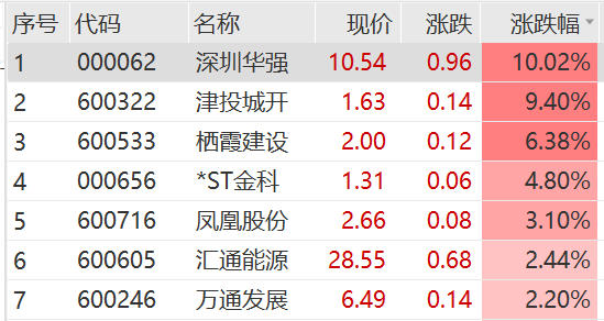 上午11点左右,a股房地产板块大幅上涨。截至中午收盘,深圳华强、*ST金科涨停,津投城开、凤凰股份、汇通能源涨幅居前。