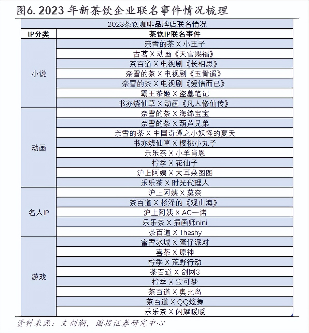 少数品牌联合爆款后,越来越多的品牌在联合营销上加码,合作的IP也多种多样。根据国投证券研究报告,2023年与新茶品牌联合的IP涵盖了小说、动画、漫画、人物、表情、名人IP。、游戏,真人影视,博物馆,美术馆,绘本,文化旅游景点,学校,饮料,高奢品牌等等。