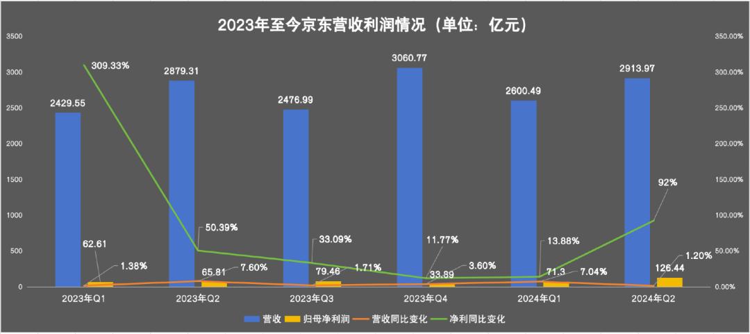 再次来看京东,本季度收入为2914亿元,同比增长1.2%,也是2023年以来增长最低点。