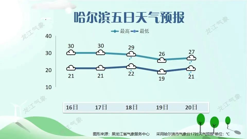 16日白天最高气温:大兴安岭北部、伊春北部、佳木斯东部、双鸭山东部、鸡西部、牡丹江25。~27℃,其他地区28℃~30℃。