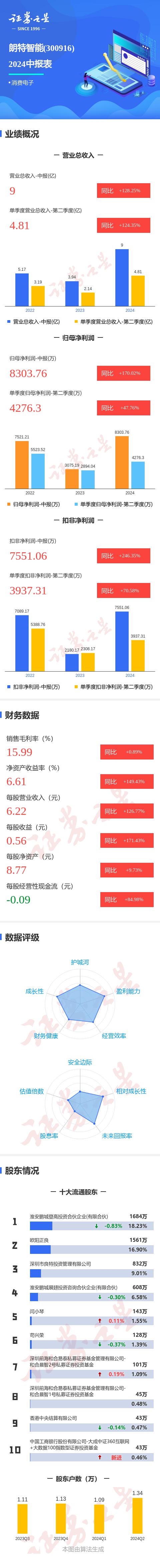 证券之星消息,朗特智能 2024 年中报告显示,公司主要收入 9.0 亿元,同比增长 128.25%;归母净利 8303.76 一一万元,同比增长 170.02%;扣非净利润 7551.07 一一万元,同比增长 246.35%;其中 2024 2008年第二季度,公司单季度主营收入 4.82 亿元,同比增长 124.35%;单季度归母净利润 4276.3 一一万元,同比增长 47.76%;单季度扣除非净利润 3937.31 一一万元,同比增长 70.58%;负债率 投资收益29.73% 555.45 一万元,财务费用 -1538.88 万元,毛利率 15.99%。
