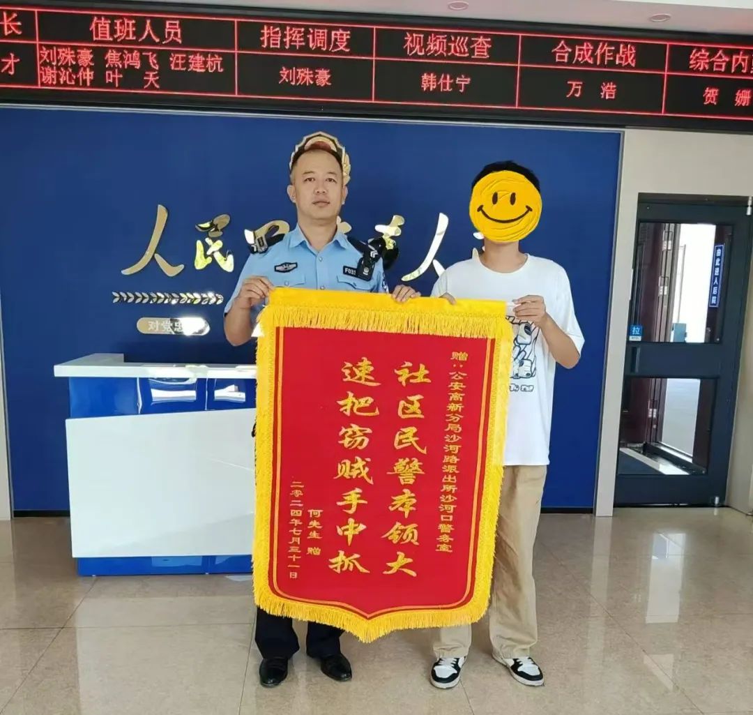 案件解决后,受害者小何特意为沙河路派出所设计了一面横幅,以表达他的感激之情。横幅上的话简单真诚,既是对郭海中警察工作的肯定,也是对社区警察热情无私奉献精神的高度赞扬。