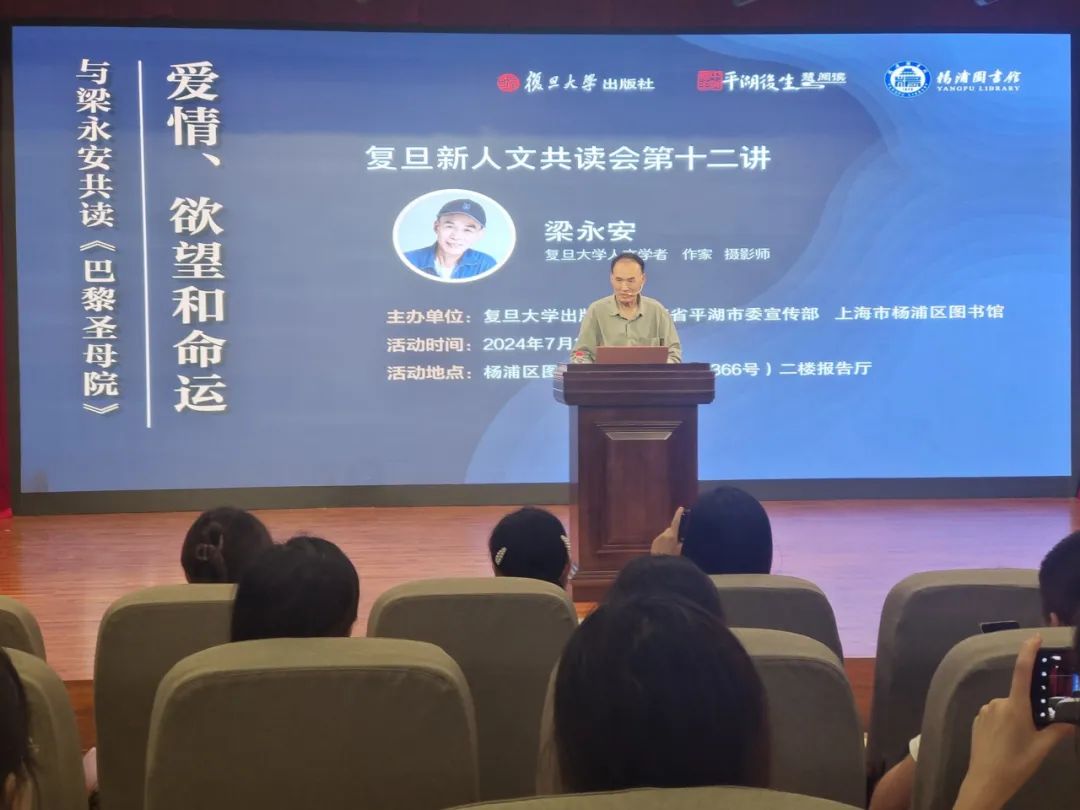 近日,“复旦新人文共读会”系列第十二讲在杨浦区图书馆二楼报告厅举行,由复旦大学出版社、浙江省平湖市委宣传部、上海市杨浦区图书馆联合主办。复旦大学人文学者梁永安教授系列主理人分享了题为“感情、欲望、命运——共读巴黎圣母院”的主题,带领读者重新审视感情、欲望与命运的关系,学会在复杂的世界里寻找和珍惜超越美丑,用善良点燃爱情的真挚感情。