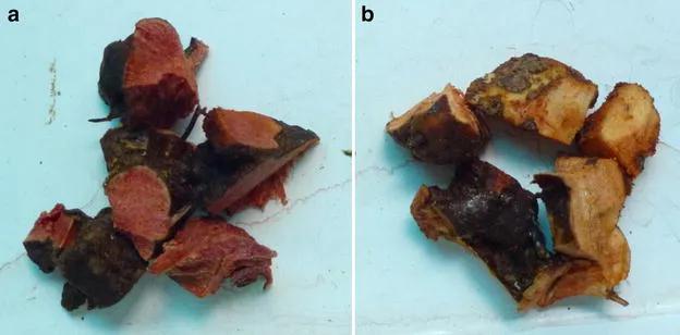 茯苓是拟层孔菌科真菌茯苓干菌核,常寄生于松树根部,形似红薯。 Trappem / wikimedia