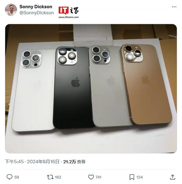 IT 世家 8 月 17 每日消息,消息来源 Sonny Dickson 昨日(8 月 16 日)在 X 平台发表文章,分享苹果 iPhone 16 Pro Max 模型照片,其中最值得注意的是新加铜色。