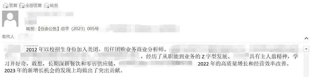 90后美团学校招生被内部提升为BM的任职邮件。