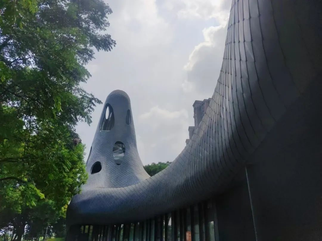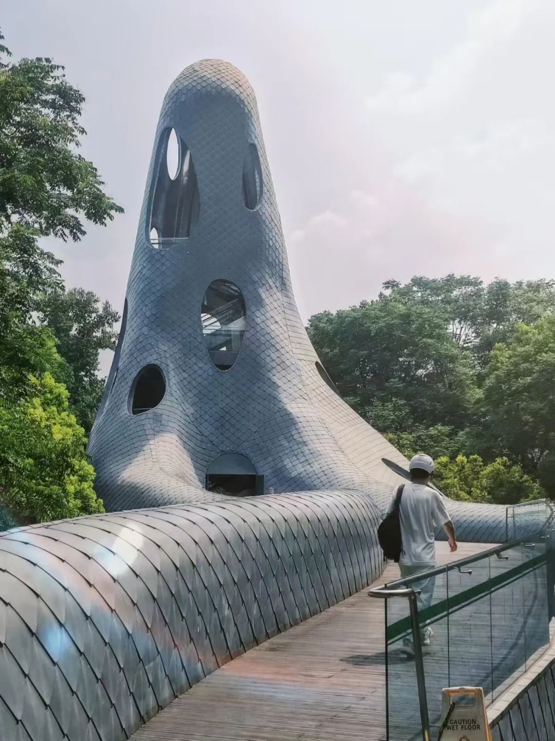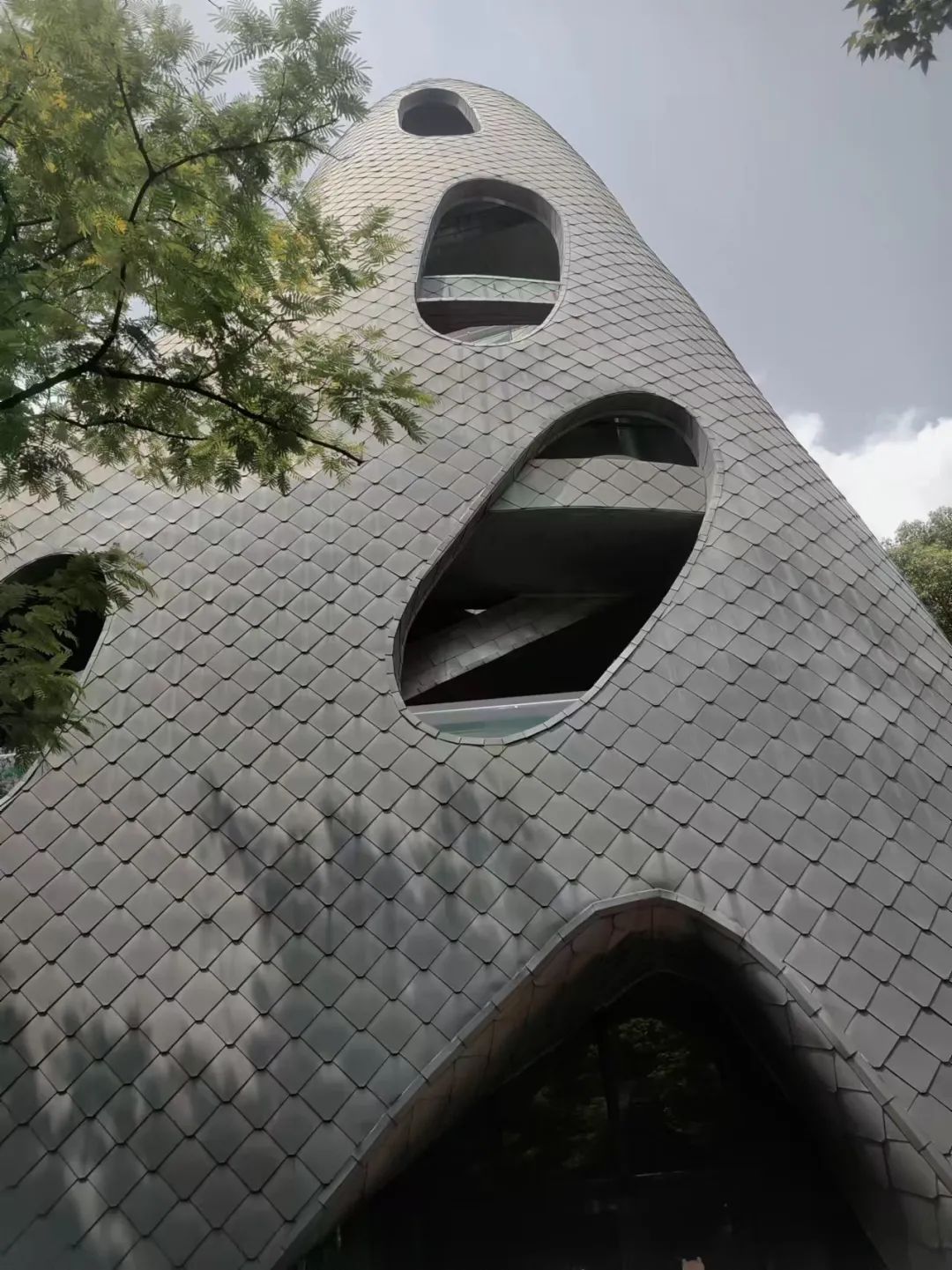 从长宁路芙蓉江路进入绿化,最引人注目的是矗立在绿化中的“未来之塔”。从远处看,它的银色鳞片外墙像钢甲一样闪闪发光,充满科幻感。