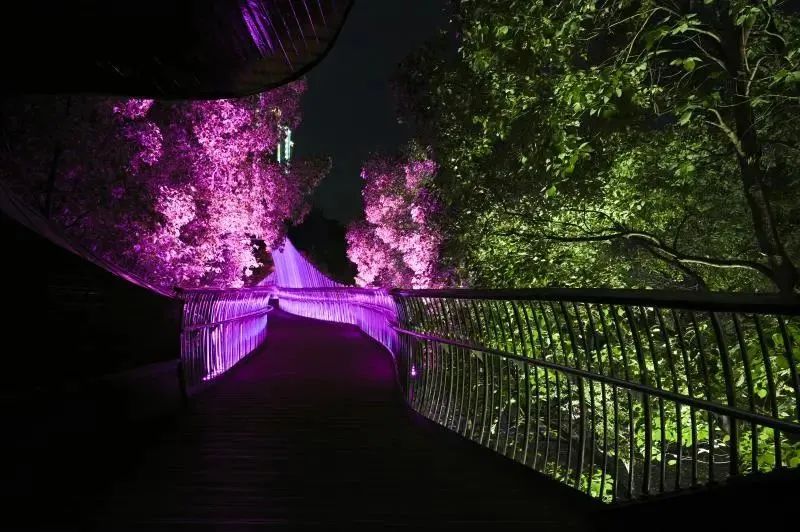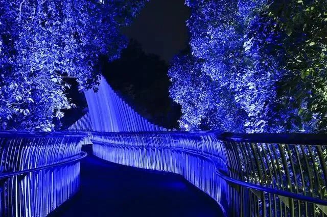 灯亮的时候,天原河滨公园的空中走廊被灯光照亮,就像半空中的一条光影隧道。苏州河景观走廊作为“苏河夜色,雅映长宁”夜景灯光的重要节点,夜晚同样美得惊人,展现了苏州河另一边的温柔与浪漫。