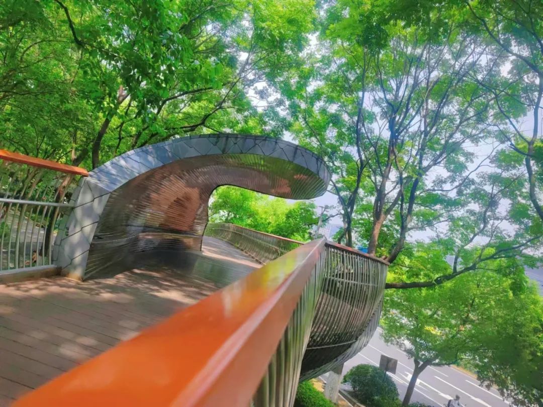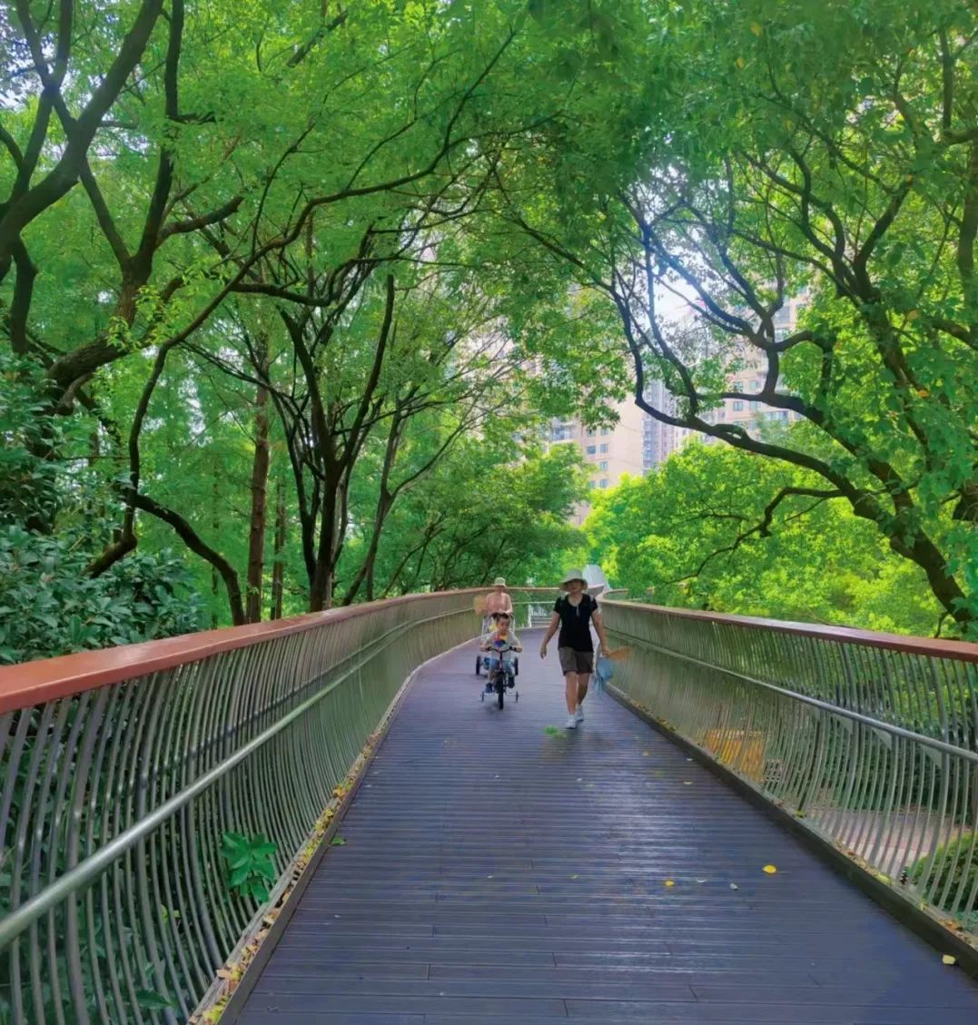 一条长达1600米的苏州河景观走廊与“未来之塔”相连,蜿蜒盘旋,宽度在1.2米至1.5米之间。漫步其中,仿佛穿越在一片绿色的海洋中,每一步都踏上了大自然的节奏。一路上,你会遇到演奏萨克斯的爷爷,悠扬的旋律为这次旅行增添了无限的魅力。