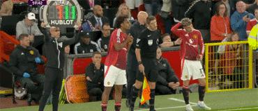 场外范尼也不淡定,滕哈格召唤齐尔克泽和加纳乔热身,观众们欢声笑语。