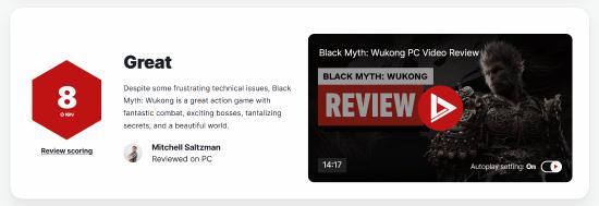 具体而言,在《黑神话:悟空》的评分中,IGN 只是为了这本书打出来 8 分数的分数,缺点是存在一些令人沮丧的技术、本土化问题。
