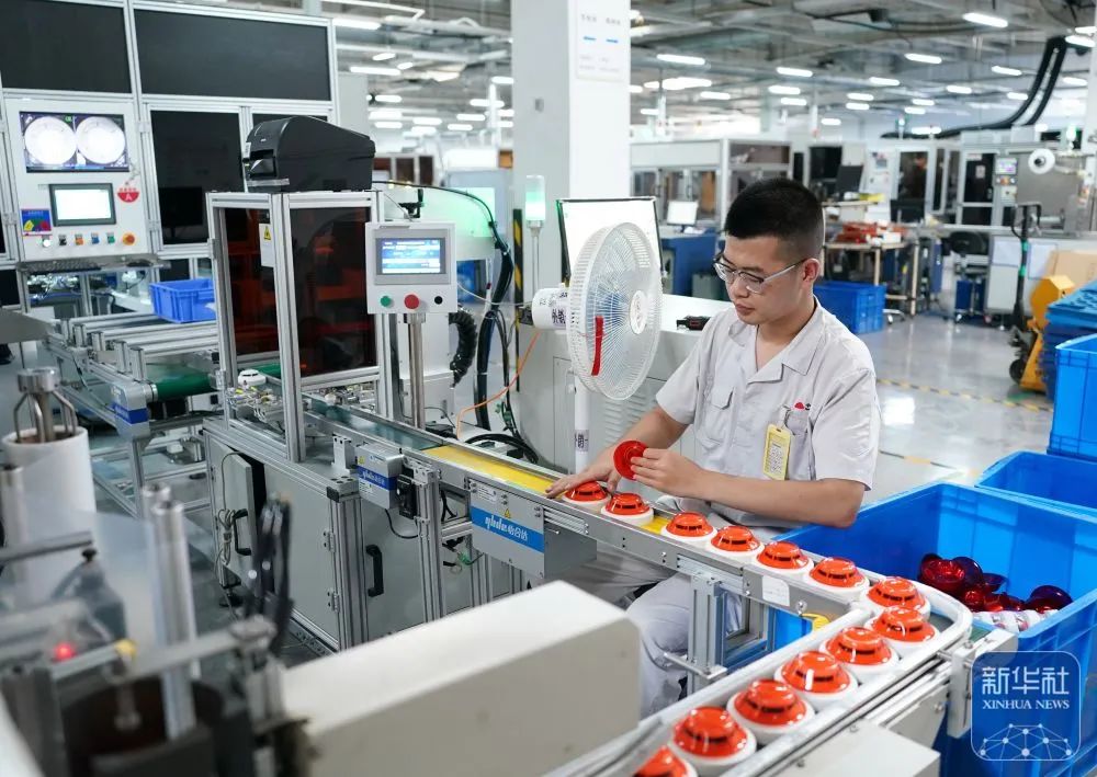 八月十五日,一家电子消防设备公司在河北省秦皇岛经济技术开发区生产车间工作。